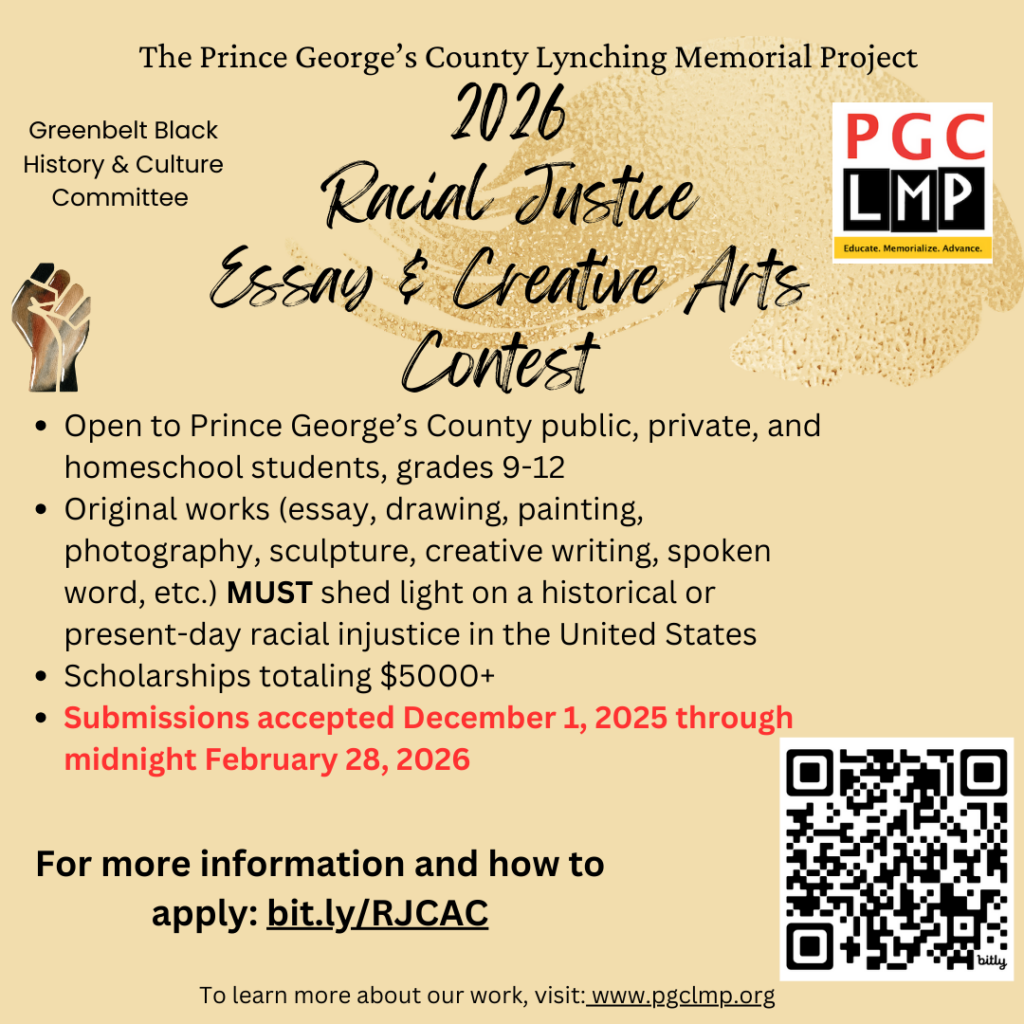 The Prince George’s County Lynching Memorial Project is pleased to announce a Racial Justice Essay and Creative Arts Contest open to Prince George’s County students in grades 9-12. Scholarships totaling $5,000 or more will be awarded to winning participants.